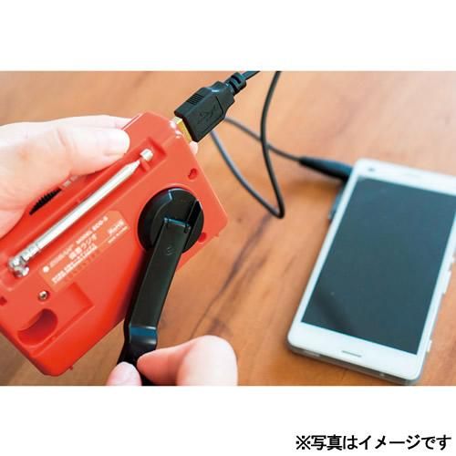 手回し充電でラジオ視聴。ライト付き。携帯電話への充電も可能。スーパーキャパシター(コンデンサ)方式の充電方式を採用。