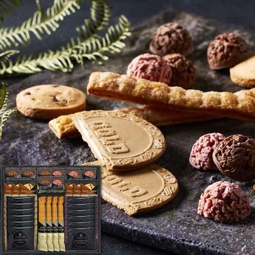 【内容】ロングスティックパイ×4、ゴーフレット(バニラ・ストロベリー)×各6、チョコクランチ(ミルク・ストロベリー)×各4、チョコチップクッキー×6・日本製
