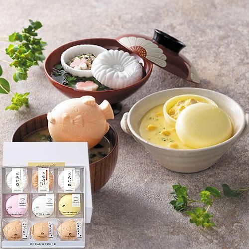 見た目だけでなく食感も楽しめる最中の詰め合わせ。最中は国産100%の最中種から作られており、だしや野菜スープにも国内素材を使用。