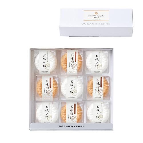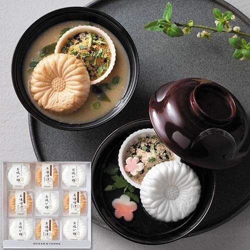 高貴で気品のある菊紋の最中に包まれた、お吸い物とお味噌汁。昔から愛されてきた日本の味を、食感の楽しい最中と共にお召し上がりください。