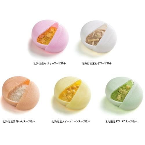 【内容】北海道産かぼちゃス-プ最中20.7g×1、北海道産玉ねぎス-プ最中11.2g×1、北海道産男爵いもス-プ最中24.2g×1、北海道産スイートコーンス-プ最中20.7g×1、北海道産アスパラス-プ最中20.7g×1 ※もち米 100%(国産)最中種