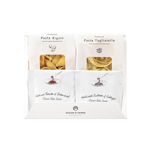 【内容】北海道産サケとキャベツクリームパスタソース17.2g×1、北海道産トマトとズワイガニクリームパスタソース16g×1、アビッシーネ・リガーテ70g×1、ロングパスタ タリアテッレ50g×1