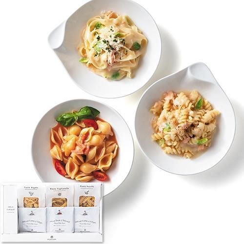 【内容】北海道産サケとキャベツクリームパスタソース17.2g×2、北海道産トマトとズワイガニクリームパスタソース16g×1、アビッシーネ・リガーテ70g×1、ロングパスタ タリアテッレ50g×1、フジッリ・ブロンズ70g×1