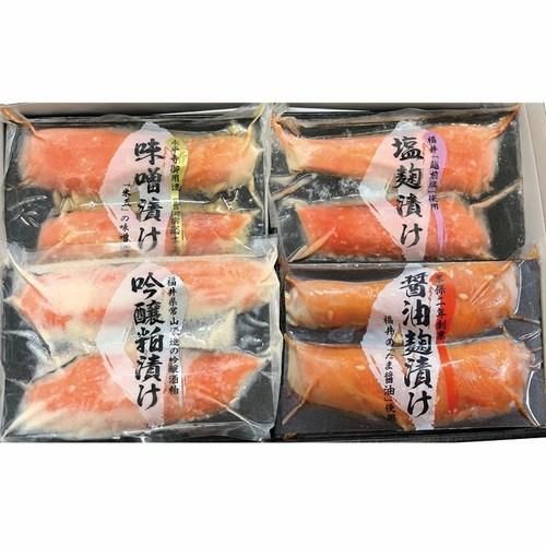 【内容】ふくいサーモン(味噌漬け・吟醸粕漬け・醤油麹漬け・塩麹漬け(各100g×2切入)×各1
