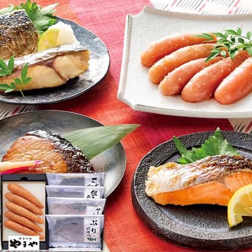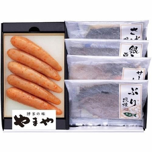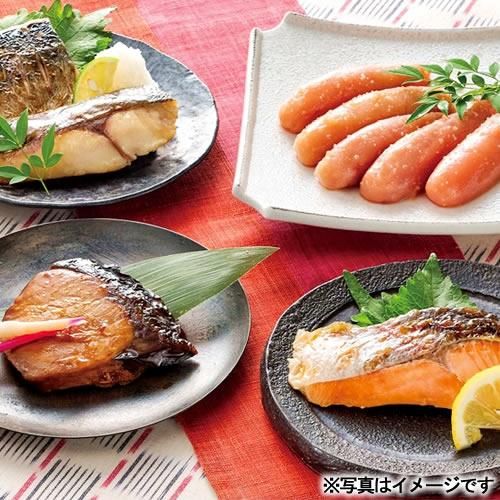 【内容】無着色辛子明太子(150g)・さば塩焼き・銀ひらす西京焼き・ぶり照焼・サーモントラウト塩焼き(各55g)×各1