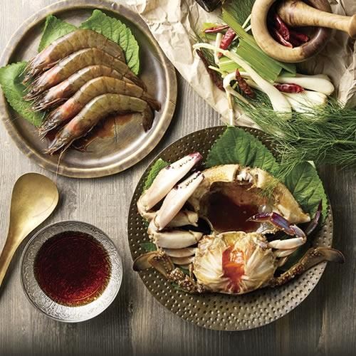 【内容】カンジャンケジャン(カニ1杯約300g)・カンジャンセウ(シロアシエビ5尾約180g)・ソース(200g)×各1