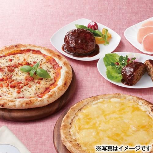 【内容】デミグラスソースハンバーグ・デミグラスソースチーズ入りハンバーグ(各120g)×各2、ピザマルゲリータスペシャリテ(270g)・ピザ4種のチーズスペシャリテ(260g)・ビーフシチュー(180g)・生ハムスライス(45g)×各1