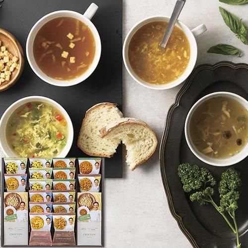 フランス家庭料理レストランmorceau 秋元さくら監修のフリーズドライスープギフト。 豊かな4種のスープとクルトンのギフトセットです。