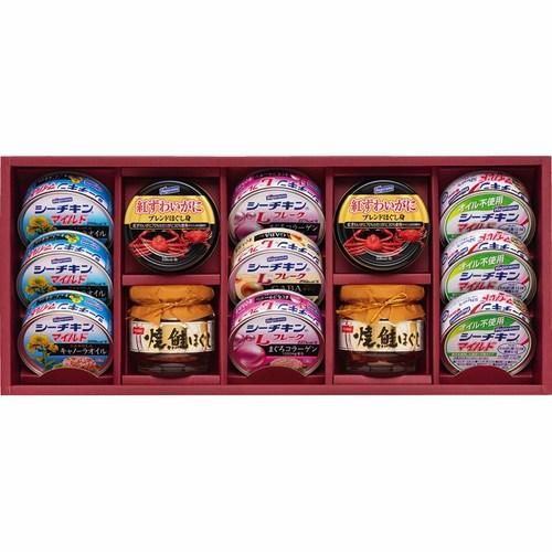 【内容】シーチキンマイルド(キャノーラオイル・オイル不使用)(各70g)×各3、シーチキンLフレークコラーゲン入り(70g)・紅ずわいがにブレンドほぐし身(55g)・焼鮭ほぐし(50g)×各2、シーチキンLフレークGABA入り(70g)×1