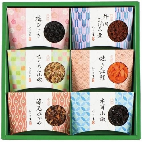 【内容】木耳山椒・梅ひじき・海老わかめ(各30g)・ちりめん山椒・焼き紅鮭・牛肉おぼろ煮(各20g)×各1
