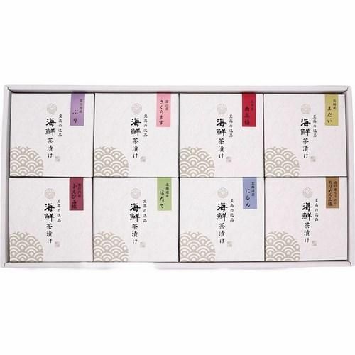 【内容】富山湾産ぶり水煮・富山産さくらます水煮・ 長崎産まだい水煮・北海道産ほたて水煮・北海道産にしん甘露煮・音戸産ちりめん山椒(15g)・瀬戸内産小えび山椒(10g)・紀州産南高梅干し×各1、だしつゆ(30g)・茶漬け薬味(0.5g)×各8