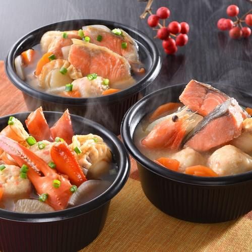 【内容】かに鍋・石狩鍋・鮭うしお汁 各280g×2個