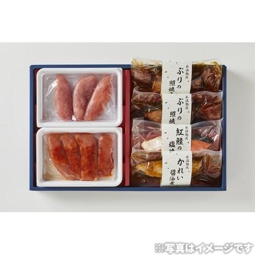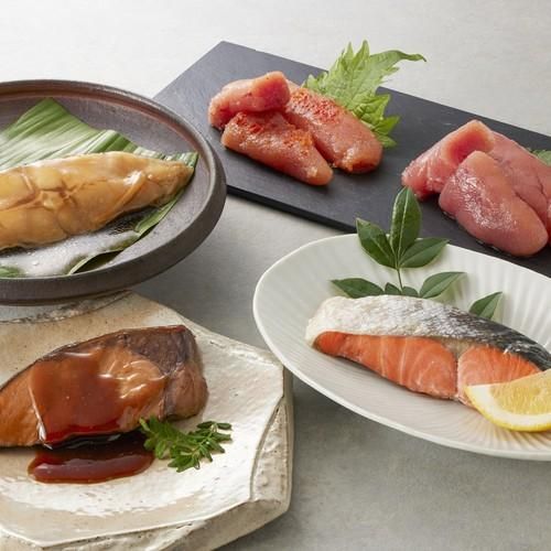 【内容】かれい醤油煮100g×1、紅鮭塩焼き60g×1、ぶりの照り焼き90g×2、あごだしたらこ・辛子明太子 各150g×1